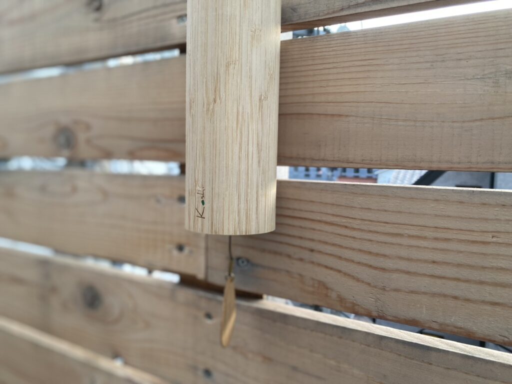 コシチャイムは、外気浴スペースのインフィニティチェア近くのウッドデッキに吊るしました🪵